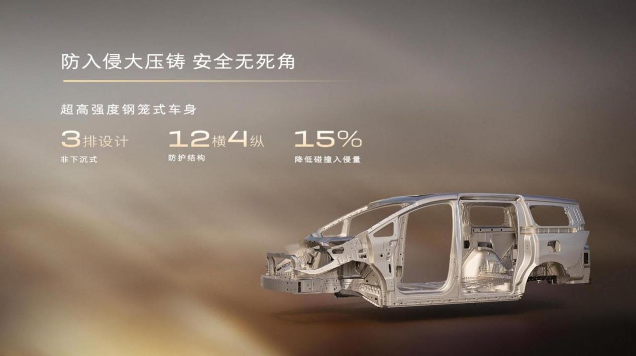 被动安全层面,采用超高强度钢笼式车身,整车高强钢占比达78%,打造12横4纵防护结构,更凭借防入侵大压铸技术,实现车身扭转刚度提升15%、碰撞乘员舱侵入量降低15%。此前新车完成了托底后追尾叠加跌落极限试验,以全优表现斩获权威双认证,保障三排乘员出行安全。