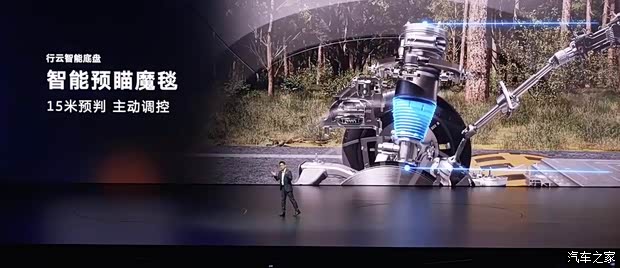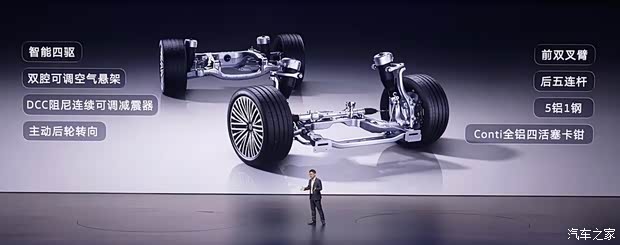 底盘方面,新车采用前双叉臂式独立悬架,后多连杆式独立悬架,行云智能底盘可实现主动后轮转向,并能实现蟹行模式,新车提供150mm行程闭式双腔空气悬架+DCC连续可变阻尼减振器,还有智能预瞄魔毯功能,车身高度随速可调,提供多种驾驶模式。同时基于VMC底盘智控中枢,可对底盘制动、驱动、转向、悬架和动力控制等进行全域融合协调,实现德系底盘调校。