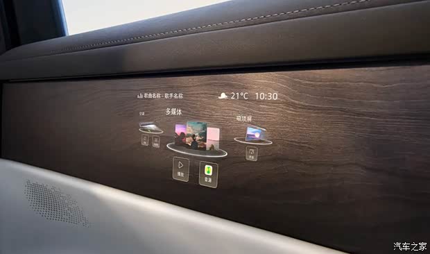 车内融合255色云镜氛围灯,通过漫反射原理展现,并提供丰富的灯语效果,诸如开门安全警告等。全车实现九屏交互,包括8.88英寸仪表魔术屏+6英寸二排门板魔术屏+15.6英寸2.5K中控双联屏+W-HUD+21.4英寸3K后排吸顶屏+流媒体后视镜+拓展手机屏。魔术屏通过创新技术,屏幕关闭时可与内饰融为一体,二排门板魔术屏可以随时调控温度、座椅位置、冰箱等。4音区语音控制还提供语音助手形象,并还可以实现手势交互。ERA Sound带来全车27个扬声器,包含4个独立头枕音响。