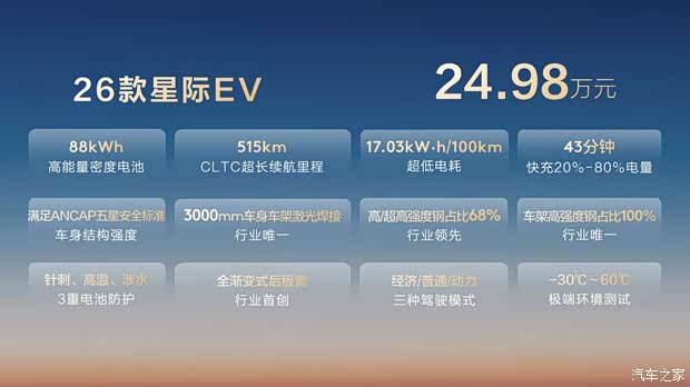 2026款T60同样搭载柴油发动机,最大功率120kW,峰值扭矩410N·m,并配备博格华纳分时四驱系统。2026款星际EV采用纯电动力系统,配备88kWh电池组,快充20%—80%仅需43分钟,同时支持6.6千瓦外放电功能。(文/最新资讯 姚宇)