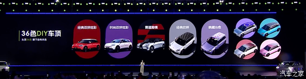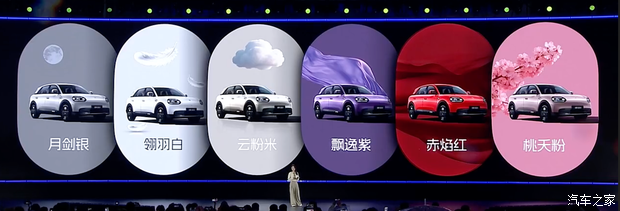来看新车,其外观采用智圆行方的设计理念,封闭式前格栅搭配两侧圆润的Q型LED大灯,整车十分灵动可爱。格栅下方配备圆角贯穿式进气口,适当增加车辆运动感。车身颜色方面,其提供月剑银、翎羽白、云粉米、飘逸紫、赤焰红、桃夭粉共六种车身配色,另外还支持36色DIY车顶,满足个性化需求。