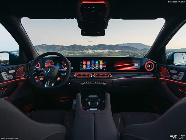内饰核心变化为MBUX Superscreen超联屏,由12.3英寸仪表+14英寸中控+14 英寸副驾屏组成,科技感拉满。空调出风口改为圆形,方向盘重新设计,保留实体按键与音量滚轮,盲操更便捷。座椅采用全新纹理材质,提供精致缝线与按摩功能,高配车型提供后排独立娱乐、多色氛围灯,豪华感与舒适性全面提升。车内用料大面积软质包裹+木纹/金属饰板,延续奔驰做工水准。AMG GLE 53 Hybrid提供AMG专属运动方向盘、金属换挡拨片、红色缝线与碳纤维饰板。