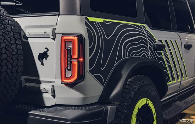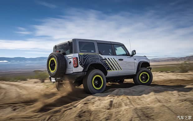 外观方面,烈马Bronco RTR整车采用灰色车漆搭配超亮青柠点缀,新车还对前格栅、灯组、前翼子板等造型进行升级,整车更具辨识度。此外,车辆还将配备防脱圈轮圈,并提供RTR专属拉花。当然,福特官方也表示,车主也可以选择不带青柠色装饰或拉花的外观。33英寸轮胎和升高悬架也是标准配置,同时还可选装的“大脚”套件,增加了35英寸轮胎、升级的Fox减震器和前后桥差速锁。