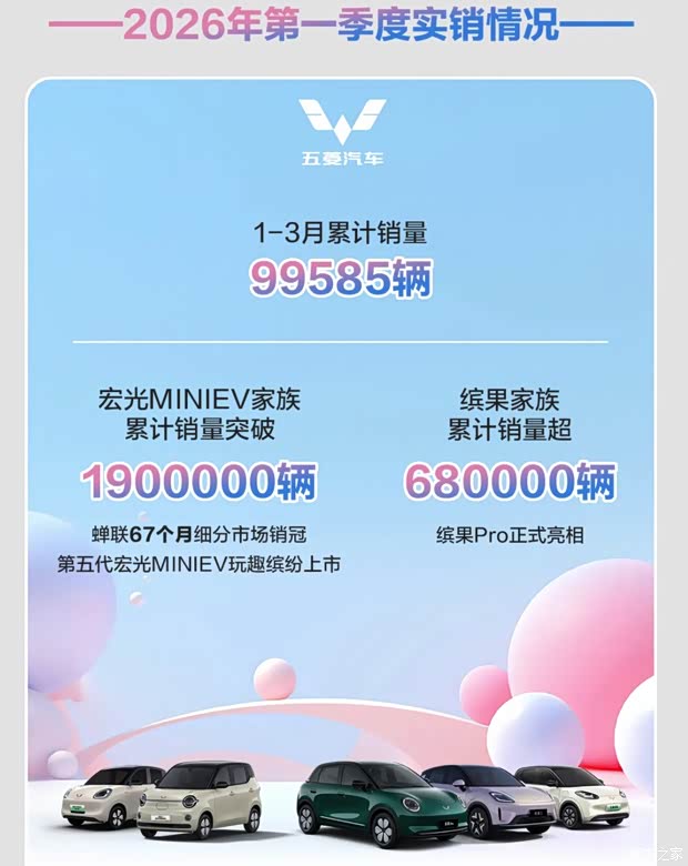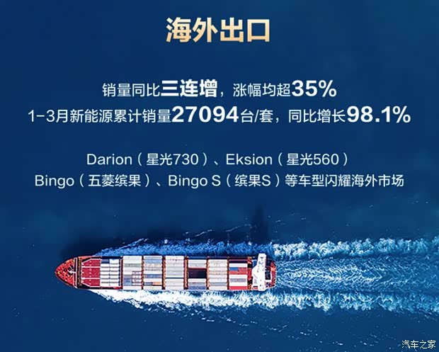 具体来看,1-3月五菱品牌微型车累计销量99585辆,(|)家族累计销量突破1900000辆,缤果家族累计销量超680000辆。星光家族家用市场持续发力,月均销量破万。1-3月销量月均超11000辆。其中星光730累计销量超39000辆;星光560上市以来累计销量超16000辆。